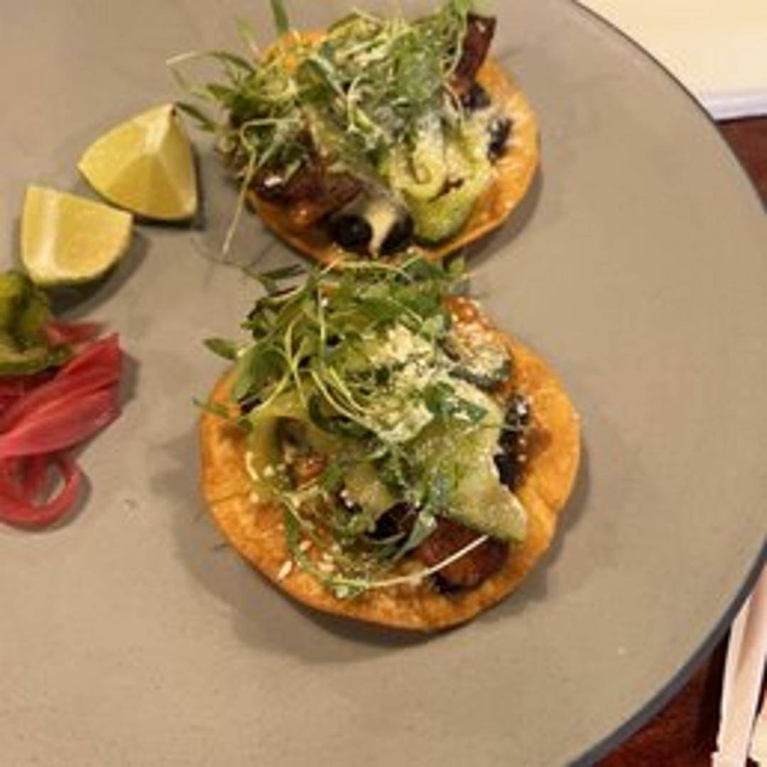 Crispy tostada shell topped with fresh, flaky sea bass. Accented with vibrant toppings, such as pico de gallo, avocado, and a zesty citrus aioli.
