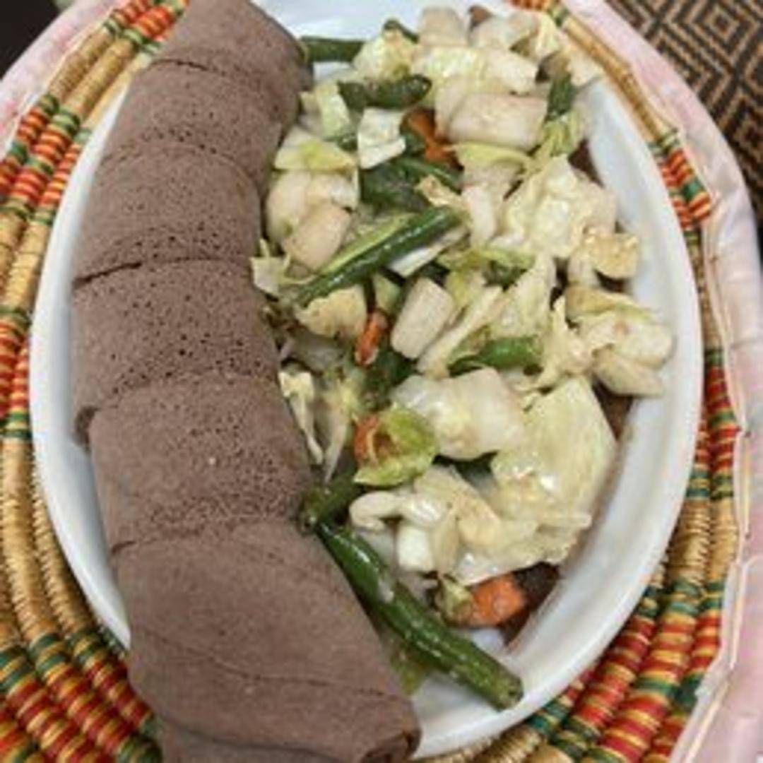 A flavorful and mildly spiced vegetarian dish featuring potatoes, carrots, cabbage, and onions sautéed with turmeric, garlic, and ginger.
