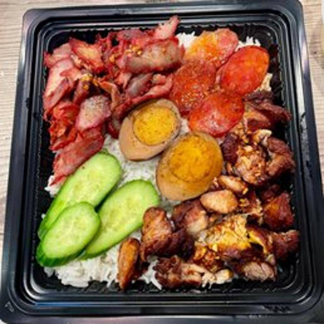 A generous plate of rice accompanied by a selection of Borneo specialties, showcasing the unique flavors of the region. May include braised pork, pickled vegetables, and other local delicacies.
