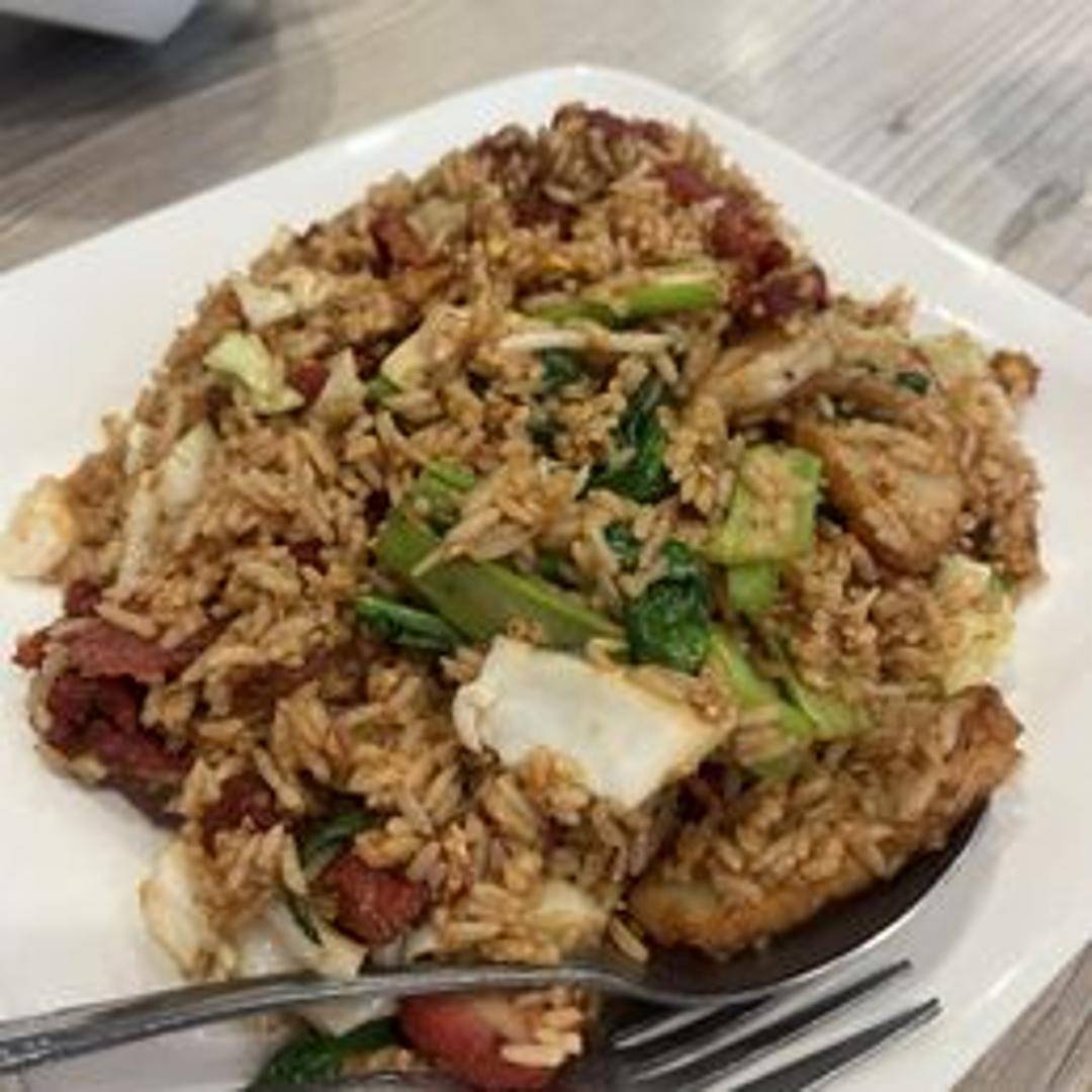 Wok-fried rice with shrimp, char siu pork, eggs, peas, carrots, and onions in a savory blend of soy sauce and spices.