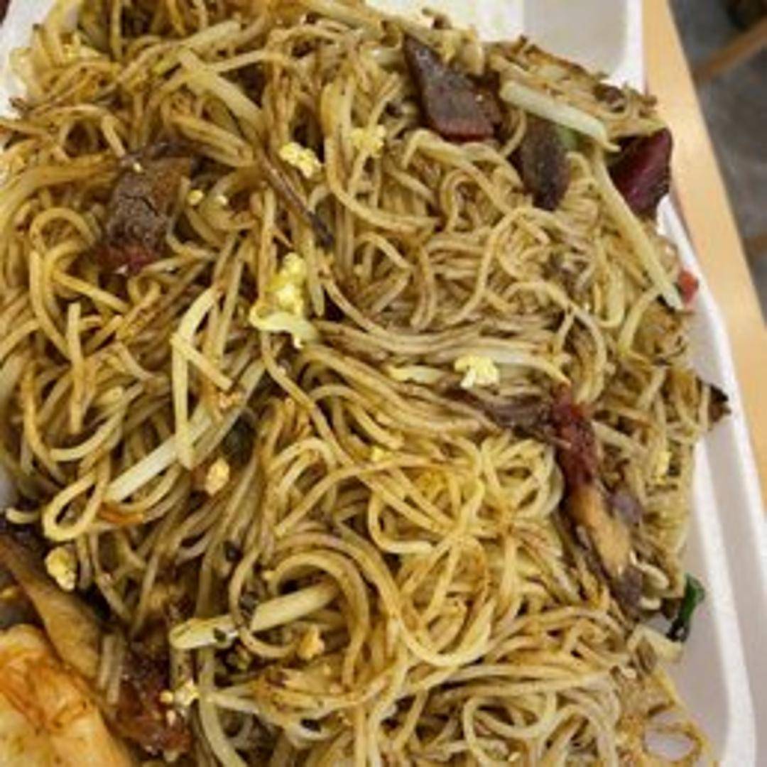 Thin rice noodles stir-fried with shrimp, chicken, BBQ pork, vegetables, and curry powder for a vibrant and flavorful dish.