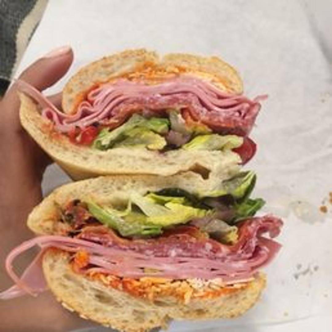 A traditional Italian sandwich featuring assorted Italian cold cuts such as mortadella, salami, and capicola, provolone cheese, lettuce, tomato, onion, and a drizzle of Italian dressing on a crusty Italian roll.