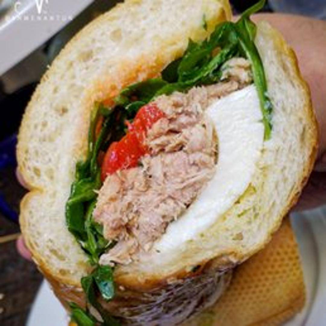 A classic tuna salad sandwich made with sustainably sourced tuna, mayonnaise, celery, onion, and seasonings served on your choice of bread with lettuce and tomato.