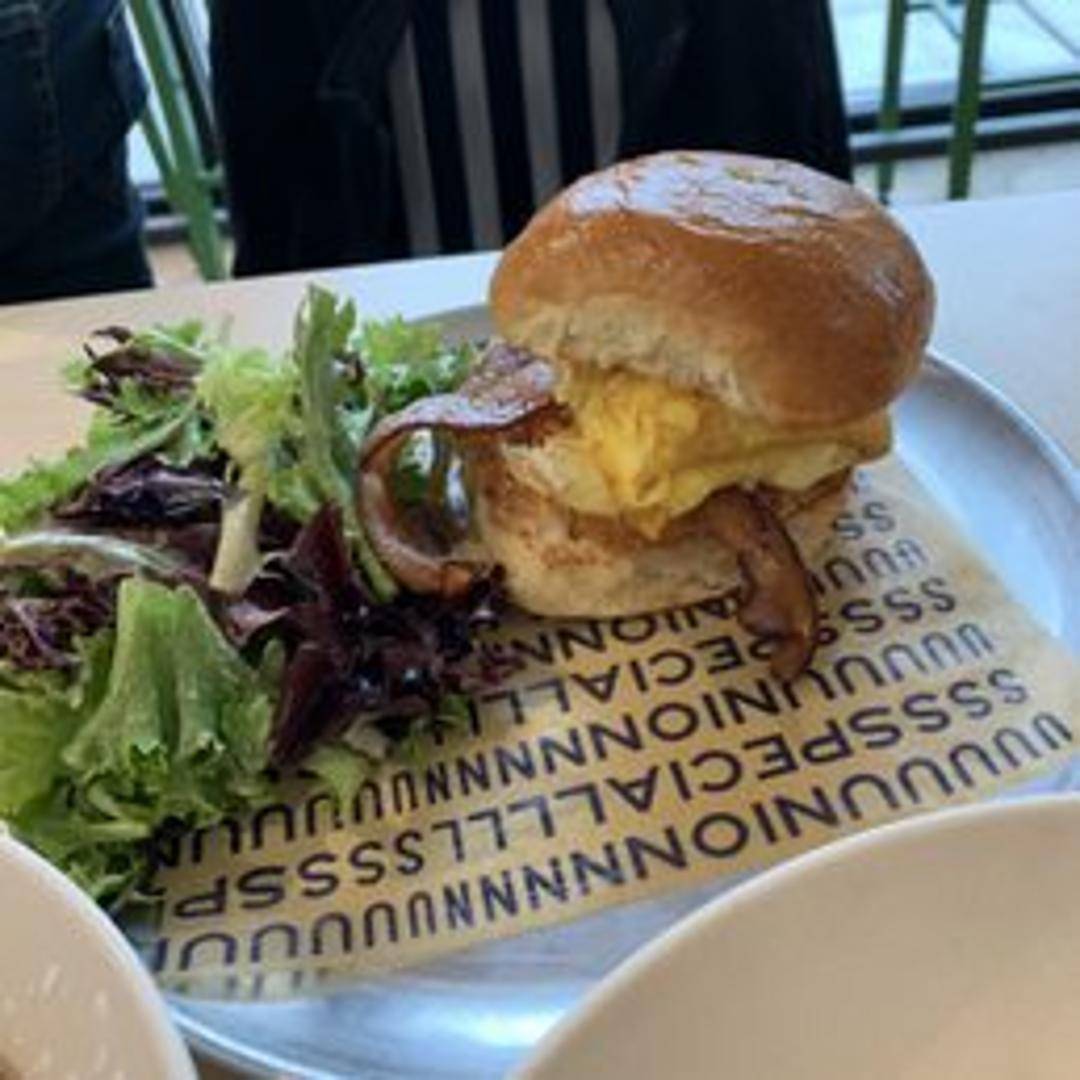 Fuel your morning with Union Special's classic Breakfast Sandwich. This essential morning meal features perfectly scrambled eggs, rich melted cheese, and your preferred choice of crispy bacon, savory sausage, or fresh avocado, all served hot on a warm, toasted roll or flaky biscuit. It’s the ideal hearty and delicious start to any day in Raleigh.