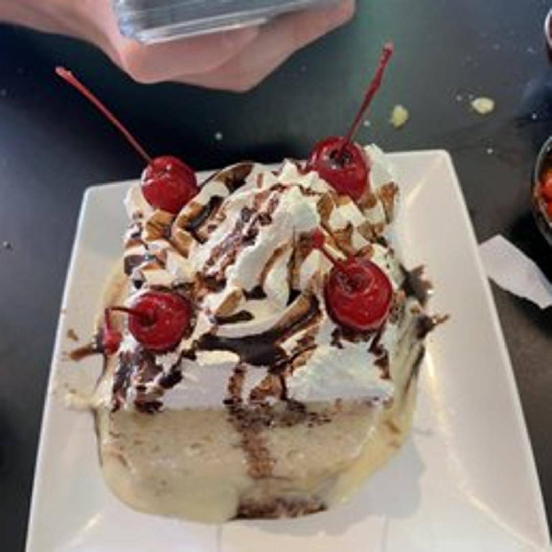 A sponge cake soaked in three kinds of milk: evaporated milk, condensed milk, and heavy cream. Topped with whipped cream and often a dusting of cinnamon.