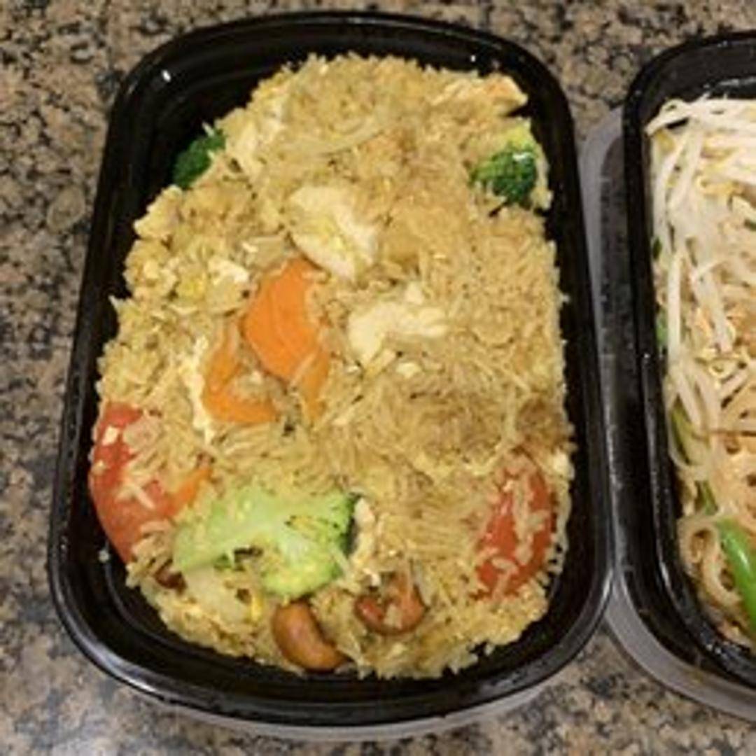 Thai-style fried rice with pineapple chunks, your choice of protein (Tofu, Vegetable, Chicken, Pork, Beef, or Shrimp), cashew nuts, raisins, carrots, peas, onions, and curry powder. Served in a pineapple shell.