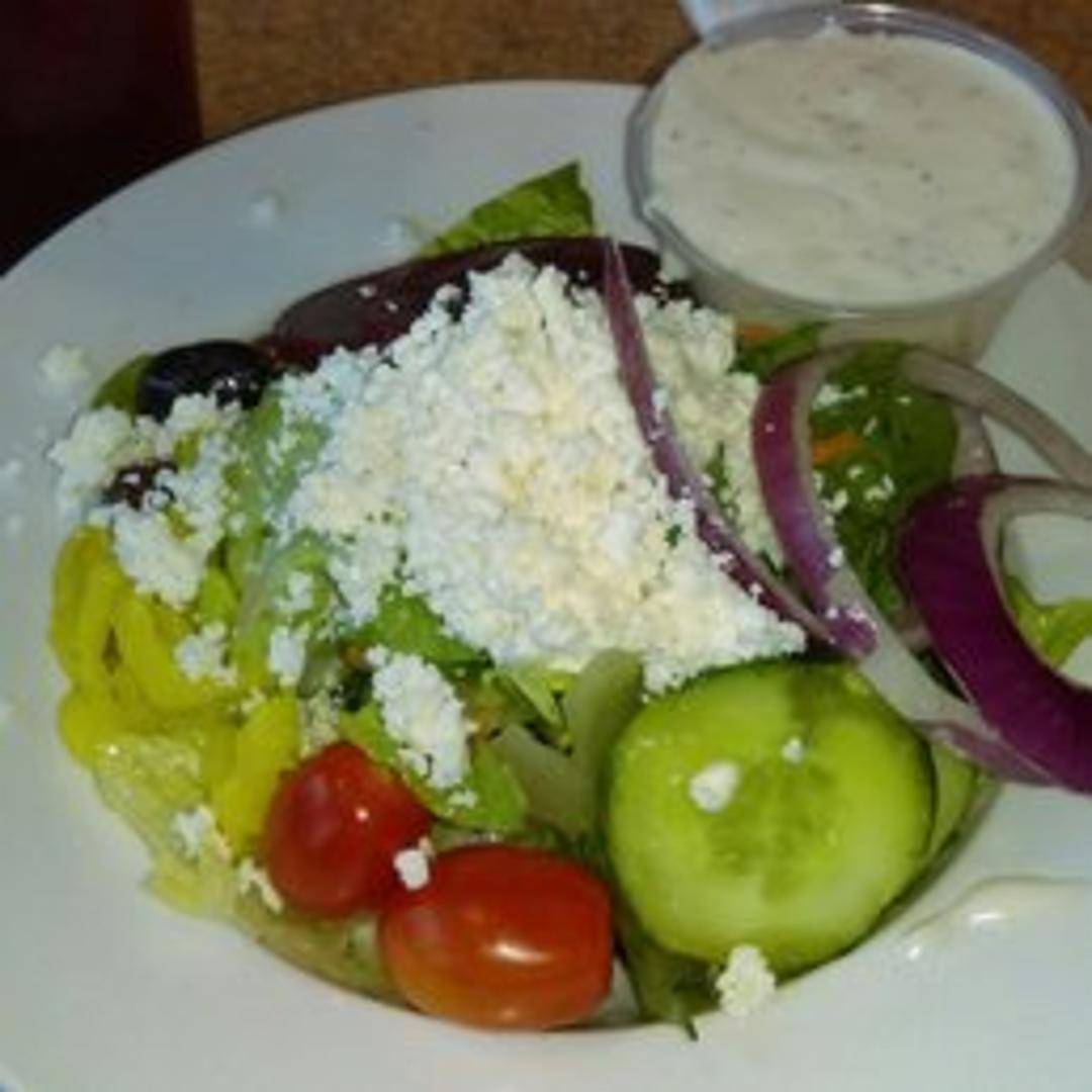 Fresh mixed greens with feta cheese, tomatoes, cucumbers, red onions, Kalamata olives, and Greek dressing.