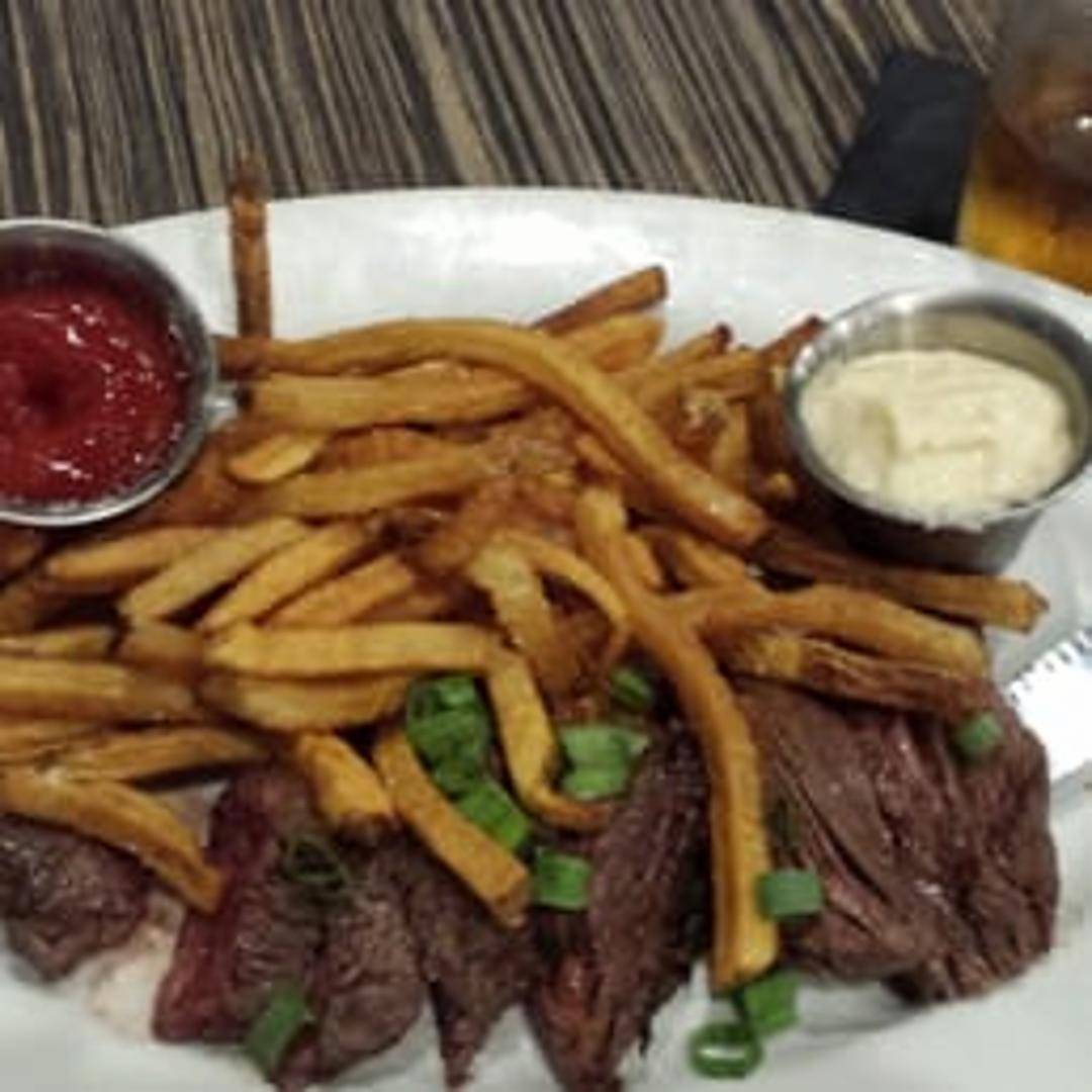 Grilled steak cooked to your desired temperature, served with a generous portion of crispy golden french fries and a side of creamy garlic aioli.