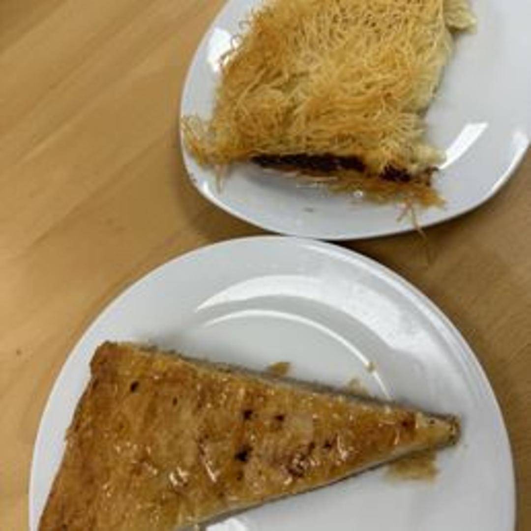 A rich, sweet pastry made of layers of flaky phyllo dough filled with chopped nuts and sweetened with syrup.