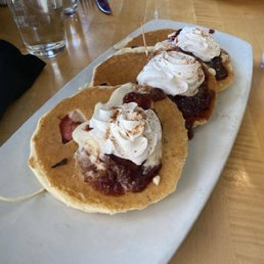 A fluffy pancake topped with creamy cheesecake filling, fresh strawberries, and a drizzle of sweet syrup.