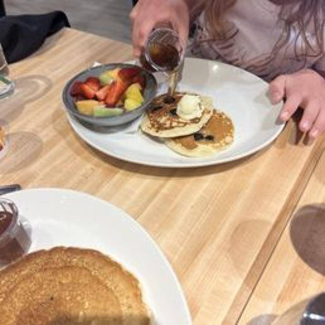 Three blueberry pancakes bursting with blueberries, served with whipped butter and syrup.