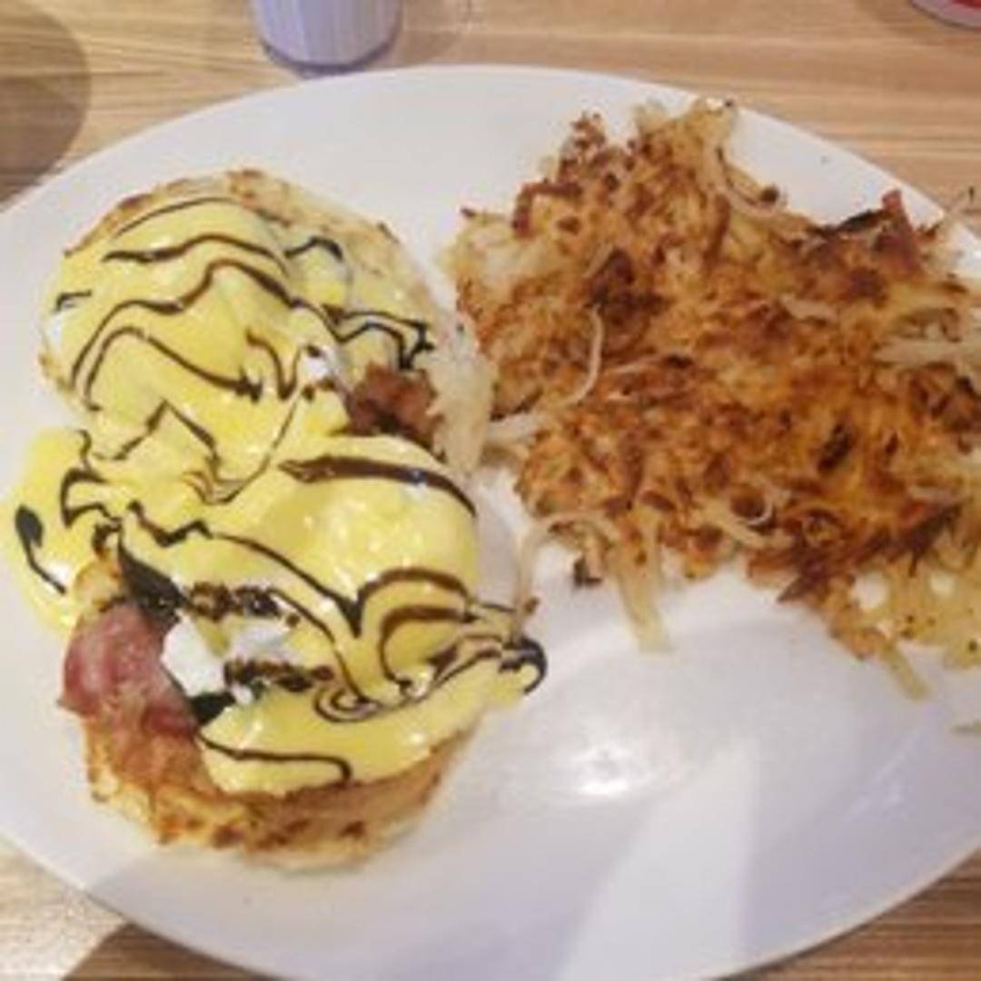 Grilled rustic bread topped with prosciutto, poached eggs, grilled tomato, fresh basil, and house-made hollandaise sauce.