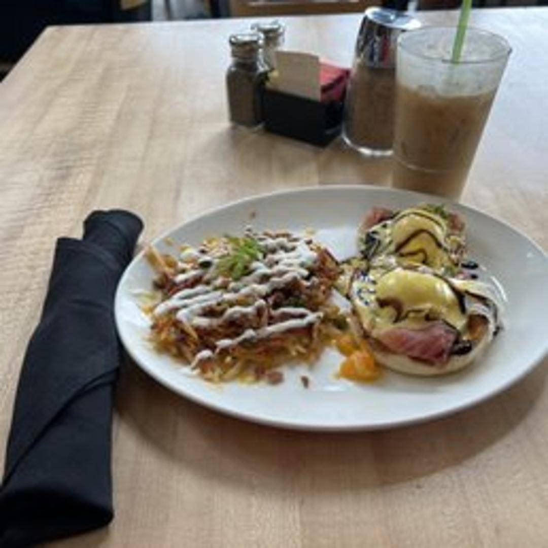 Grilled tomato and prosciutto stacked on an English muffin, topped with poached eggs, hollandaise, and fresh basil.