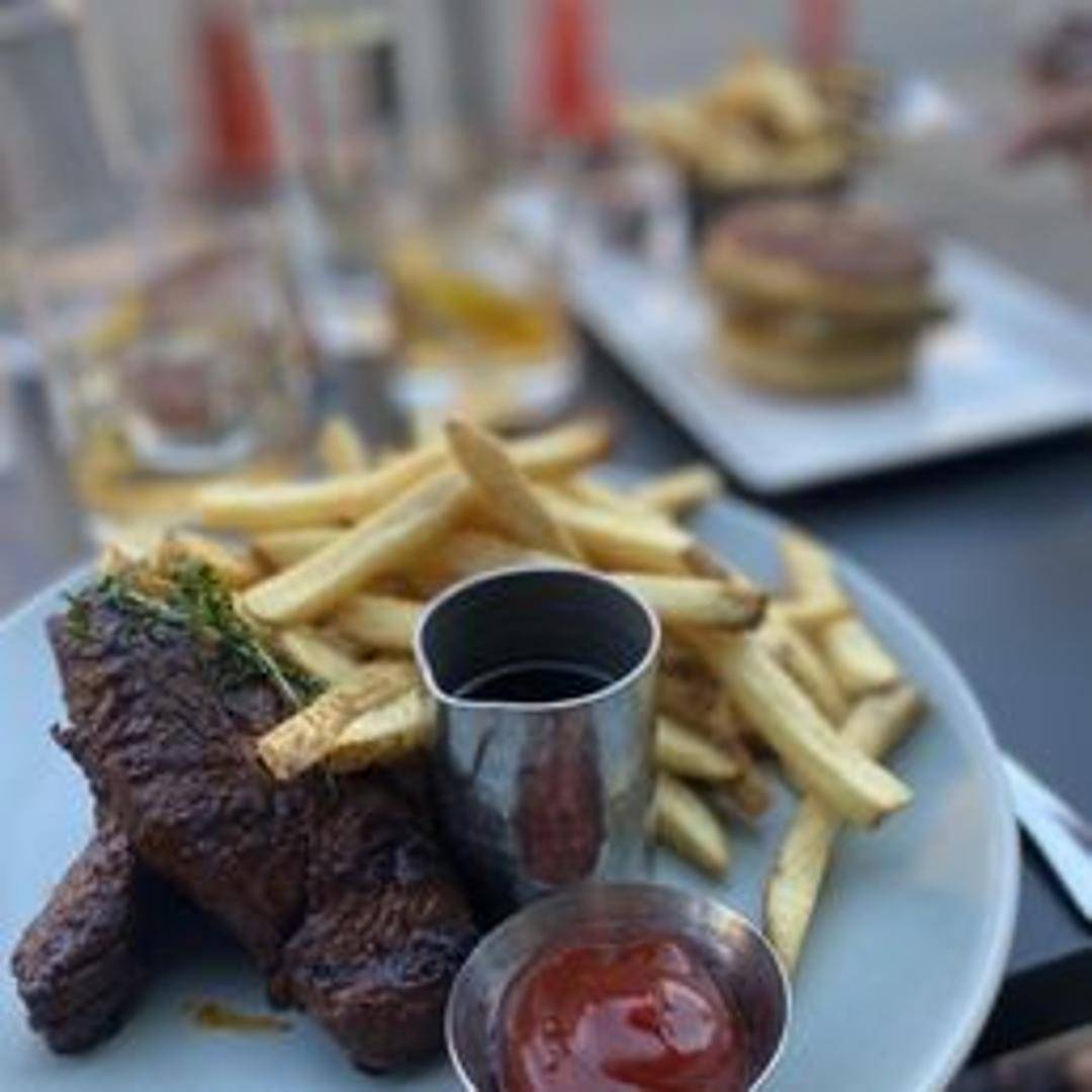 Classic preparation featuring expertly grilled steak served with crispy, golden french fries and a flavorful sauce, often a herb butter or aioli.