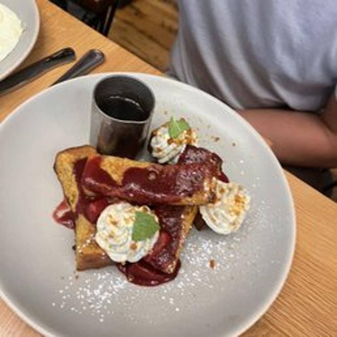 Brioche french toast topped with caramelized bananas in a rich, rum-based sauce, often served with whipped cream.