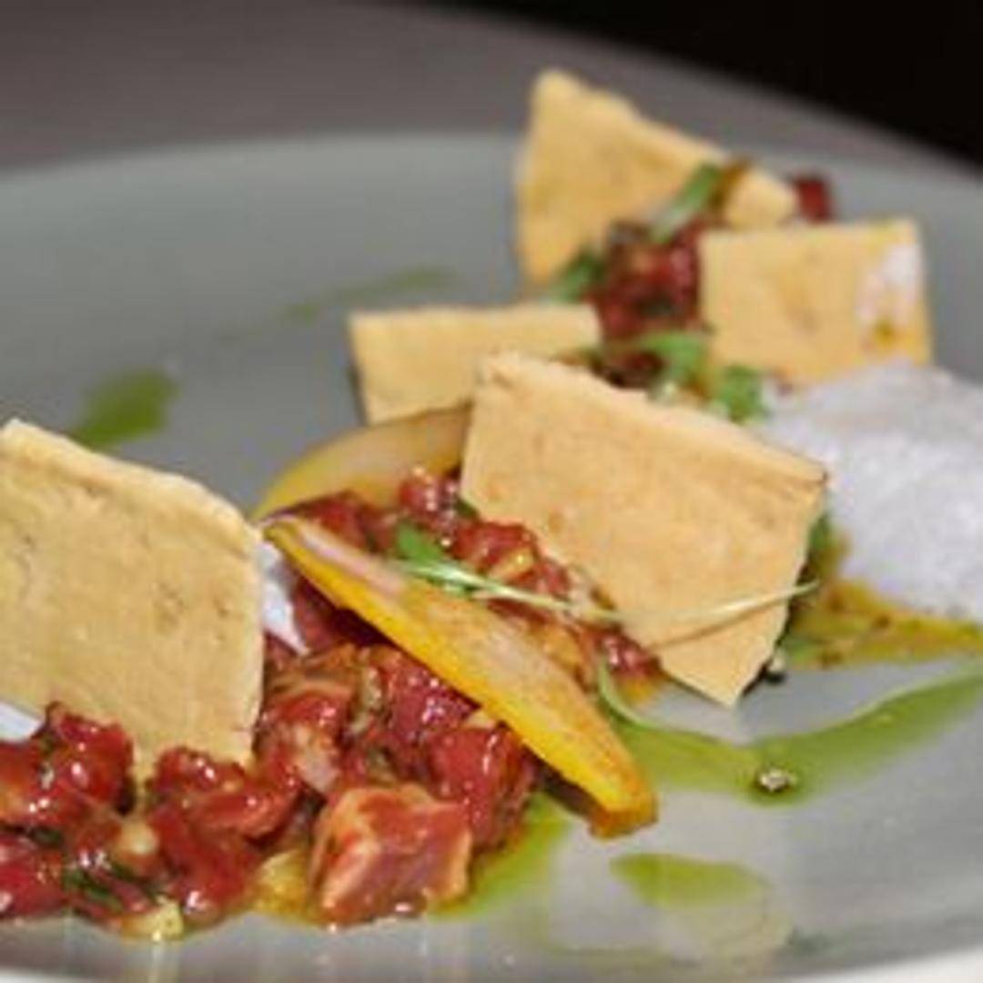Finely chopped raw beef, seasoned with capers, onions, parsley, and other spices, often served with toasted bread or crostini and a raw egg yolk.