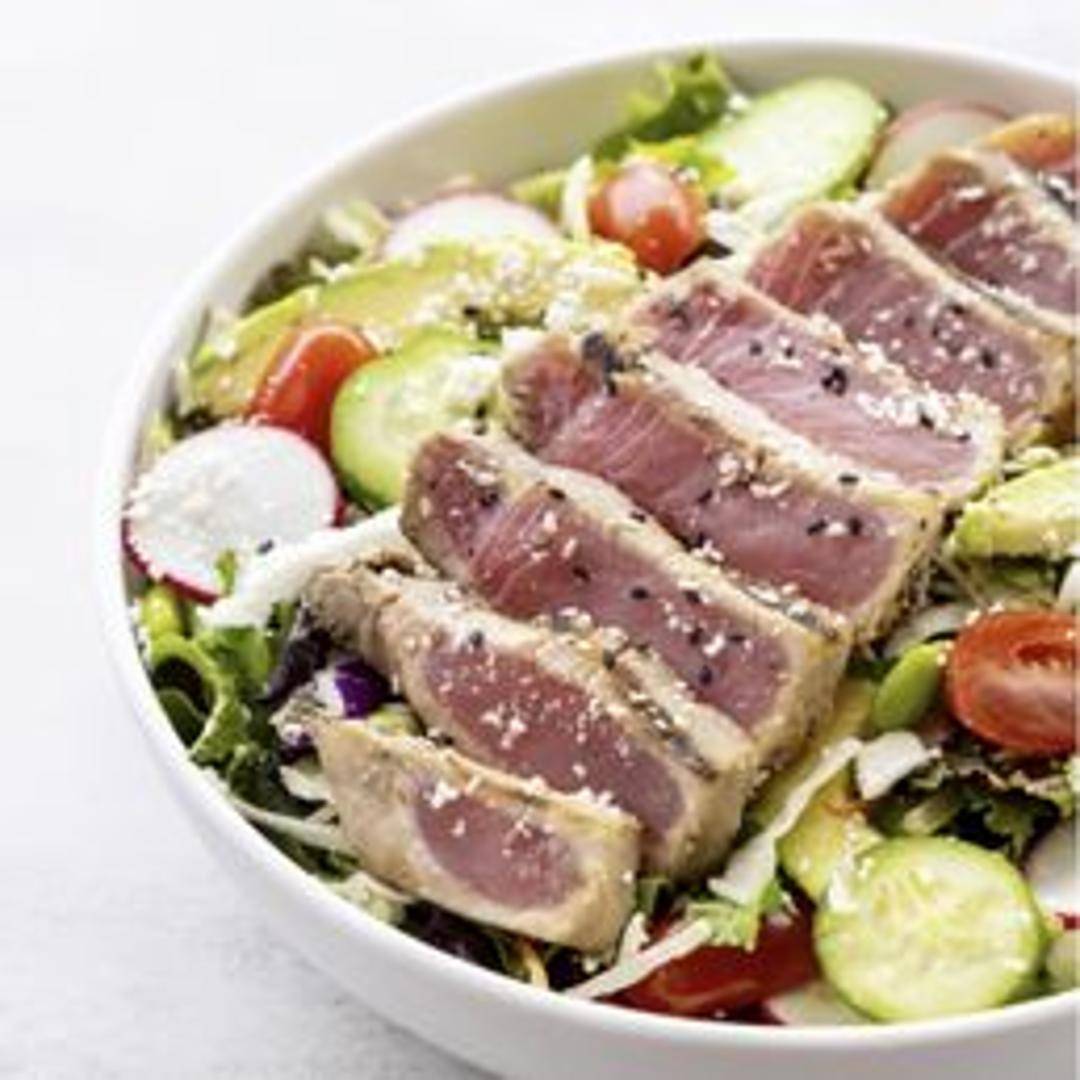 Seared Ahi tuna served over mixed greens with sliced cucumbers, carrots, edamame, avocado, and sesame seeds. Dressed with a light soy-ginger vinaigrette.