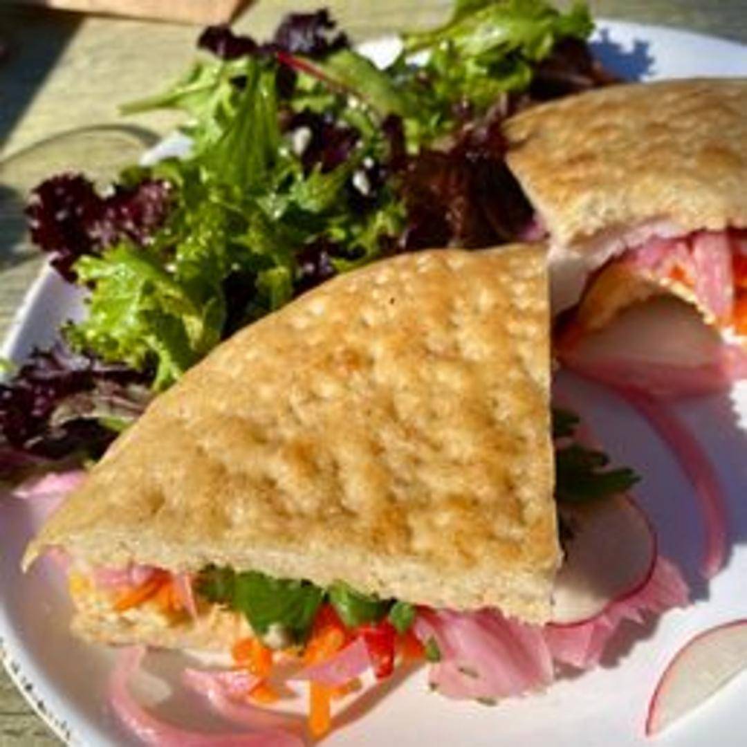 Marinated and grilled tofu with pickled carrots and daikon radish, fresh cilantro, jalapenos, and a vegan aioli, served on a toasted baguette.