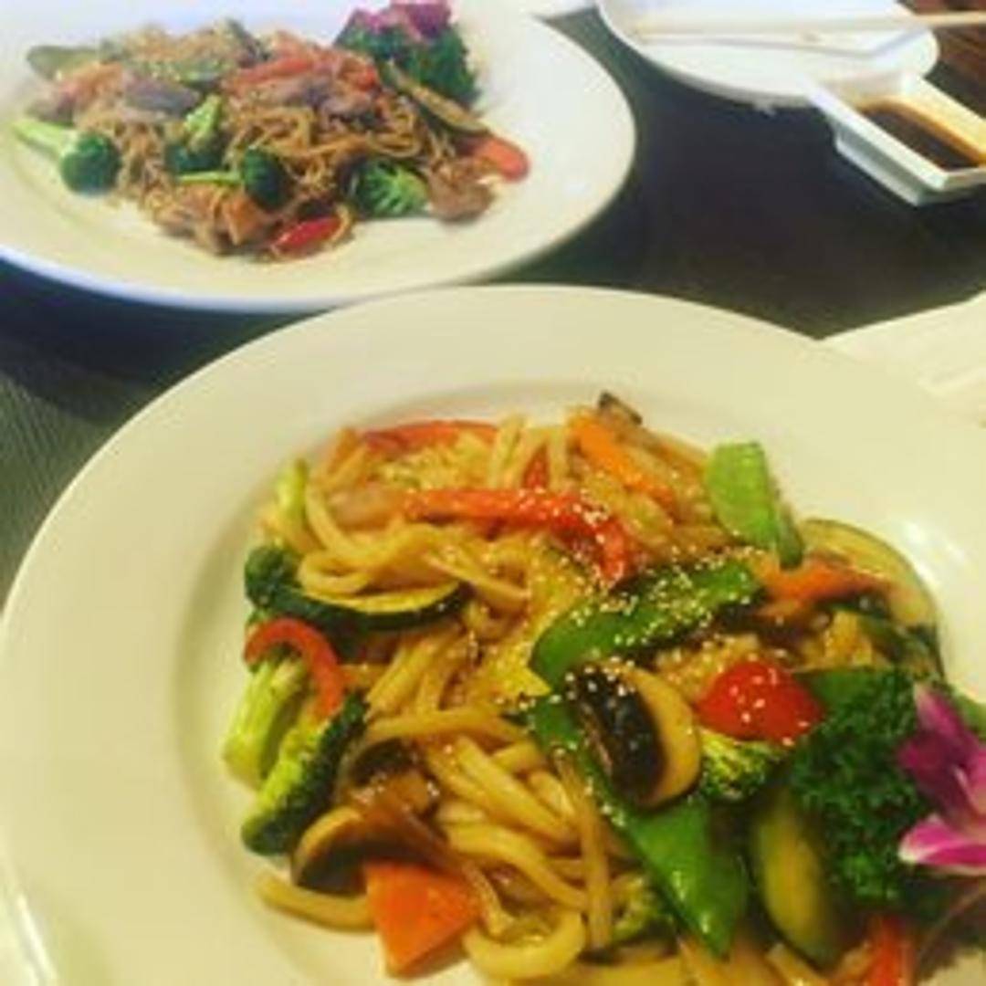 Stir-fried wheat noodles with vegetables, and protein, tossed in a savory yakisoba sauce.