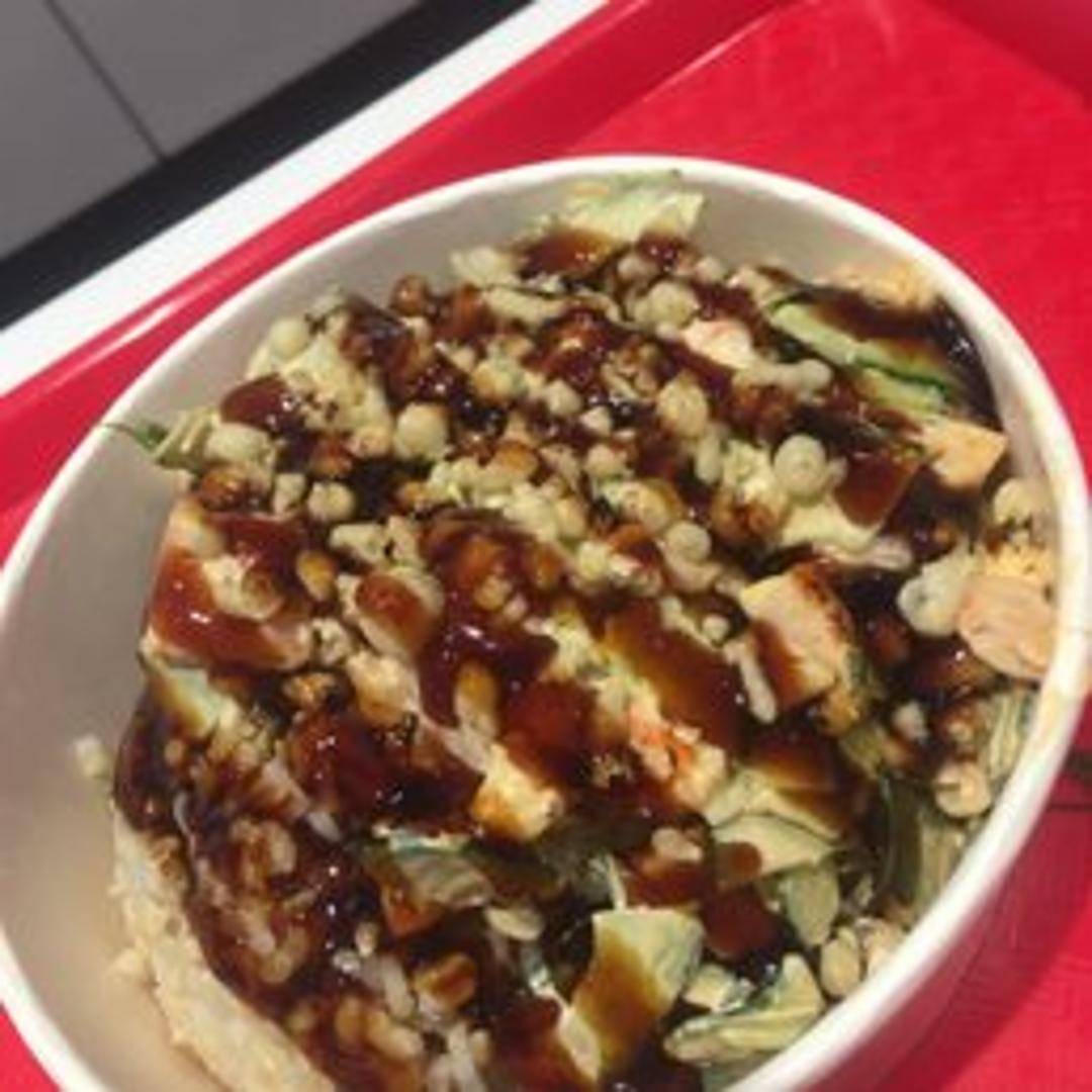 A ready-to-eat poke bowl featuring a base of rice, topped with a fiery blend of fresh tuna or salmon, avocado, masago, seaweed salad, spicy mayo, and crunchy tempura flakes. A complete and flavorful meal with a kick.