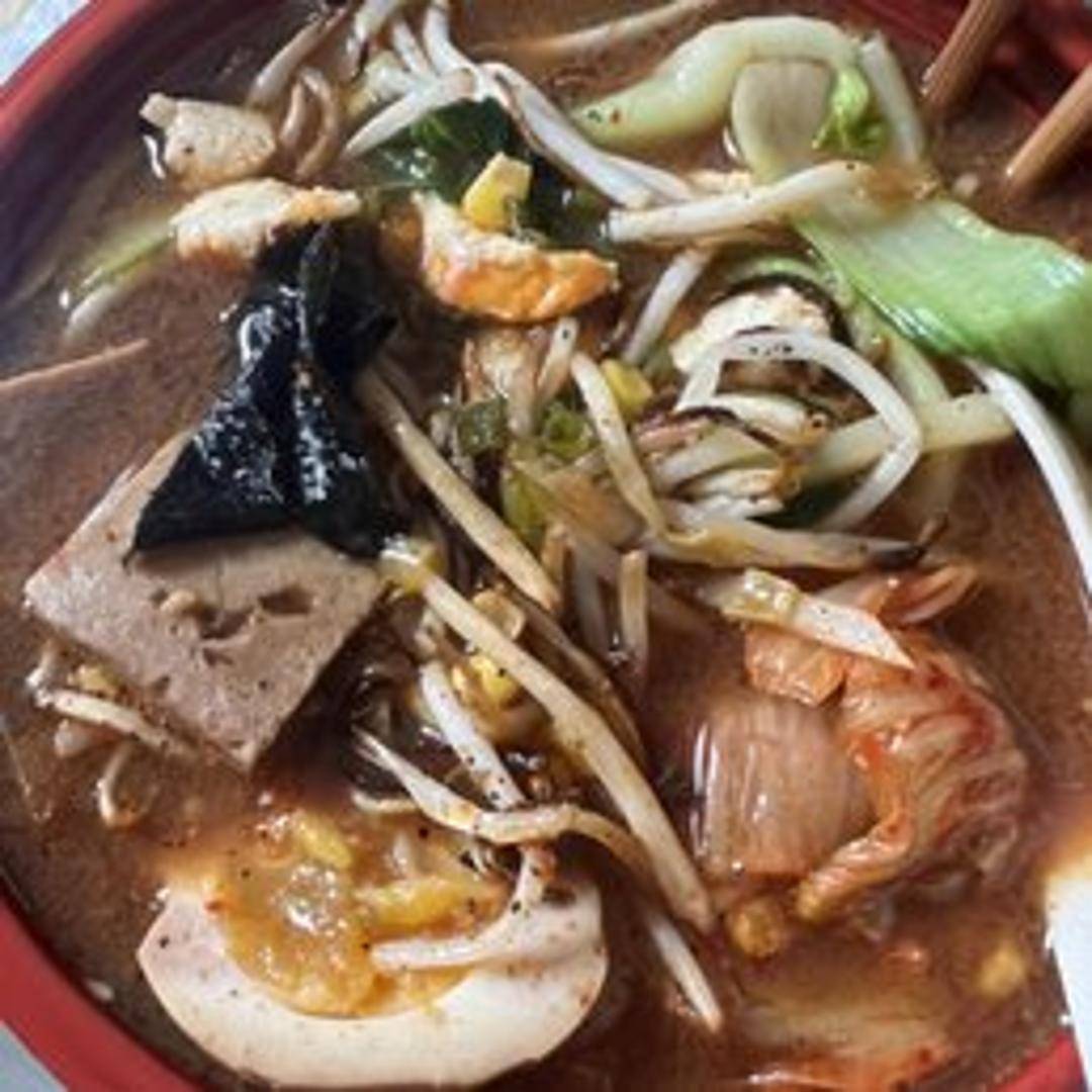 A rich and savory miso broth infused with spicy chili oil, featuring noodles, marinated tofu, corn, bamboo shoots, seaweed, and a soft 'boiled' egg.