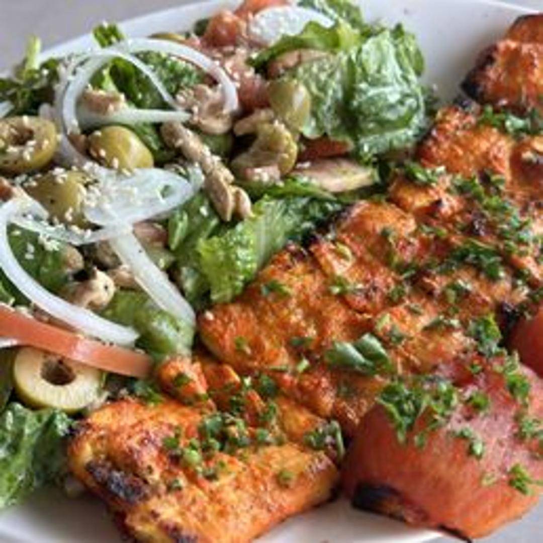 Tender and juicy marinated chicken breast, thinly sliced and grilled to a golden brown. Served with fluffy basmati rice and grilled tomato.