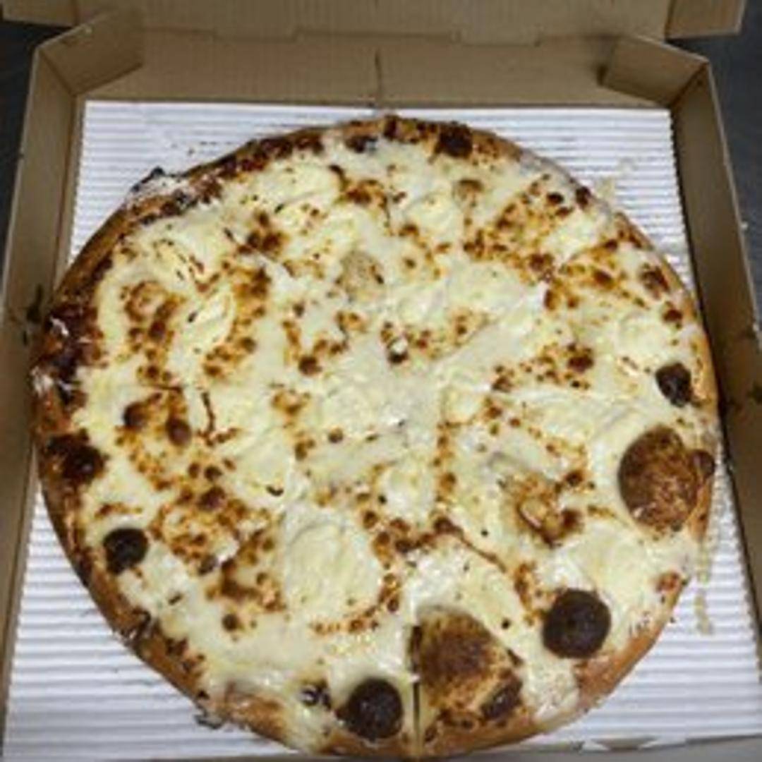 A cheese lover's dream! A pizza featuring a creamy white sauce base topped with a blend of cheeses, including ricotta, mozzarella, and parmesan.