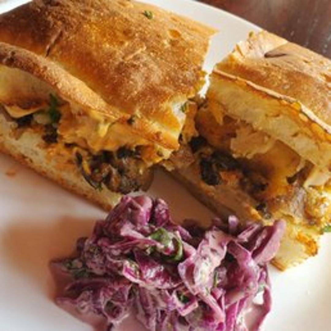 A hearty and savory sandwich featuring seasoned, plant-based meat and perfectly roasted potatoes, layered with complementary sauces and fresh greens on artisanal bread. A satisfying and flavorful vegan take on a classic comfort food.