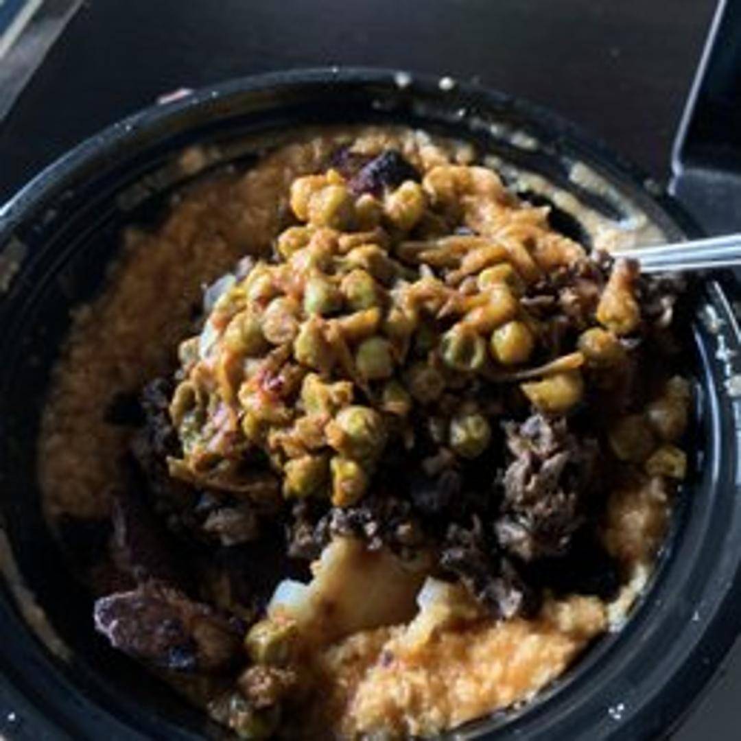 A hearty and wholesome bowl of seasoned oats, topped with a medley of roasted vegetables, toasted nuts, and a drizzle of flavorful plant-based sauce. Perfect for a nourishing breakfast, lunch, or light dinner.