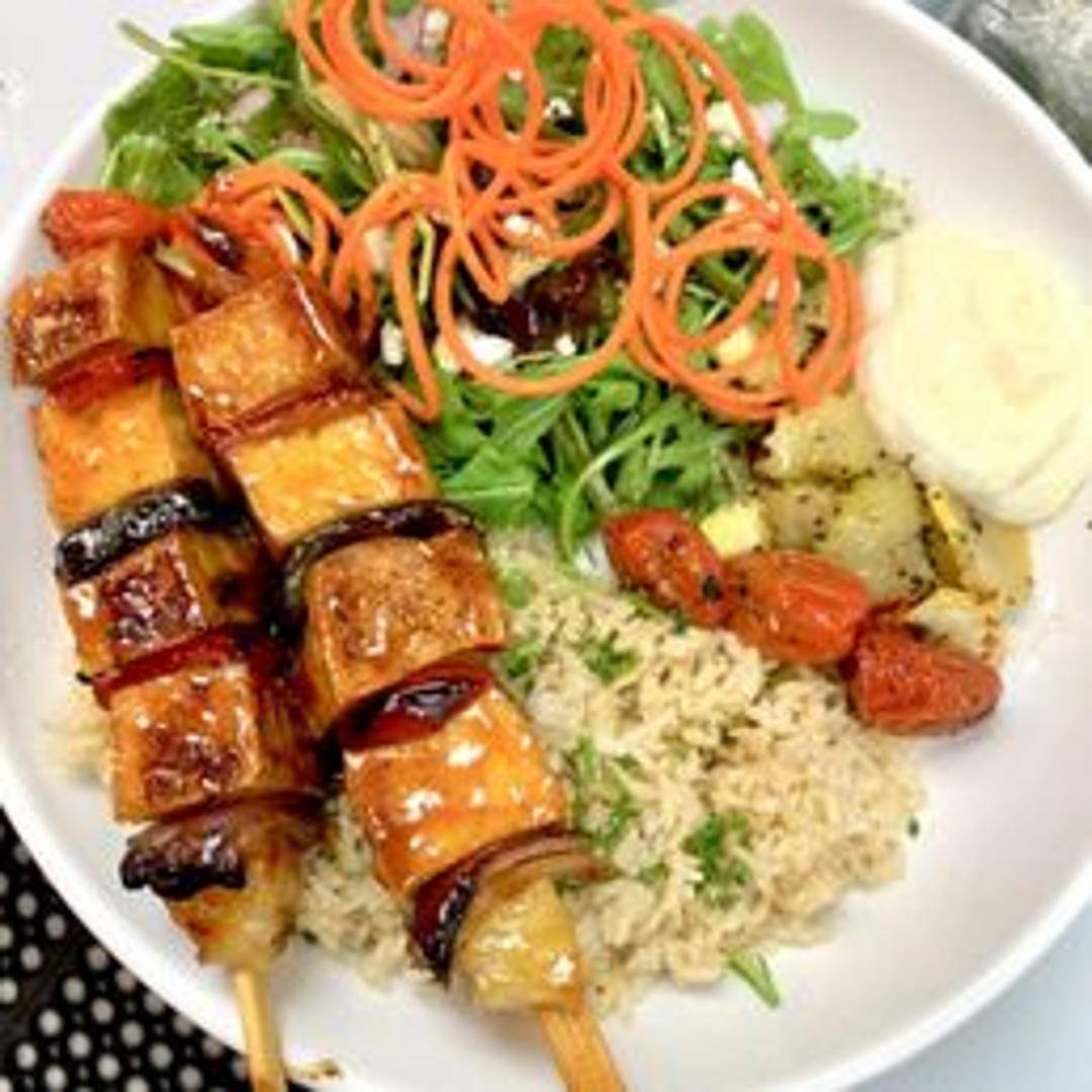 A vibrant bowl featuring a medley of fresh, seasonal vegetables, quinoa, and a light lemon vinaigrette dressing. Garnished with toasted almonds and microgreens.