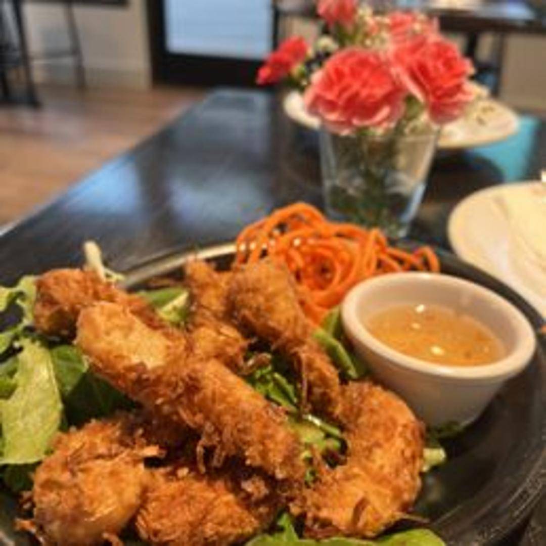 Grilled Pacific shrimp served over a bed of creamy polenta, drizzled with a spicy chili oil, and topped with a sprinkle of fresh cilantro.