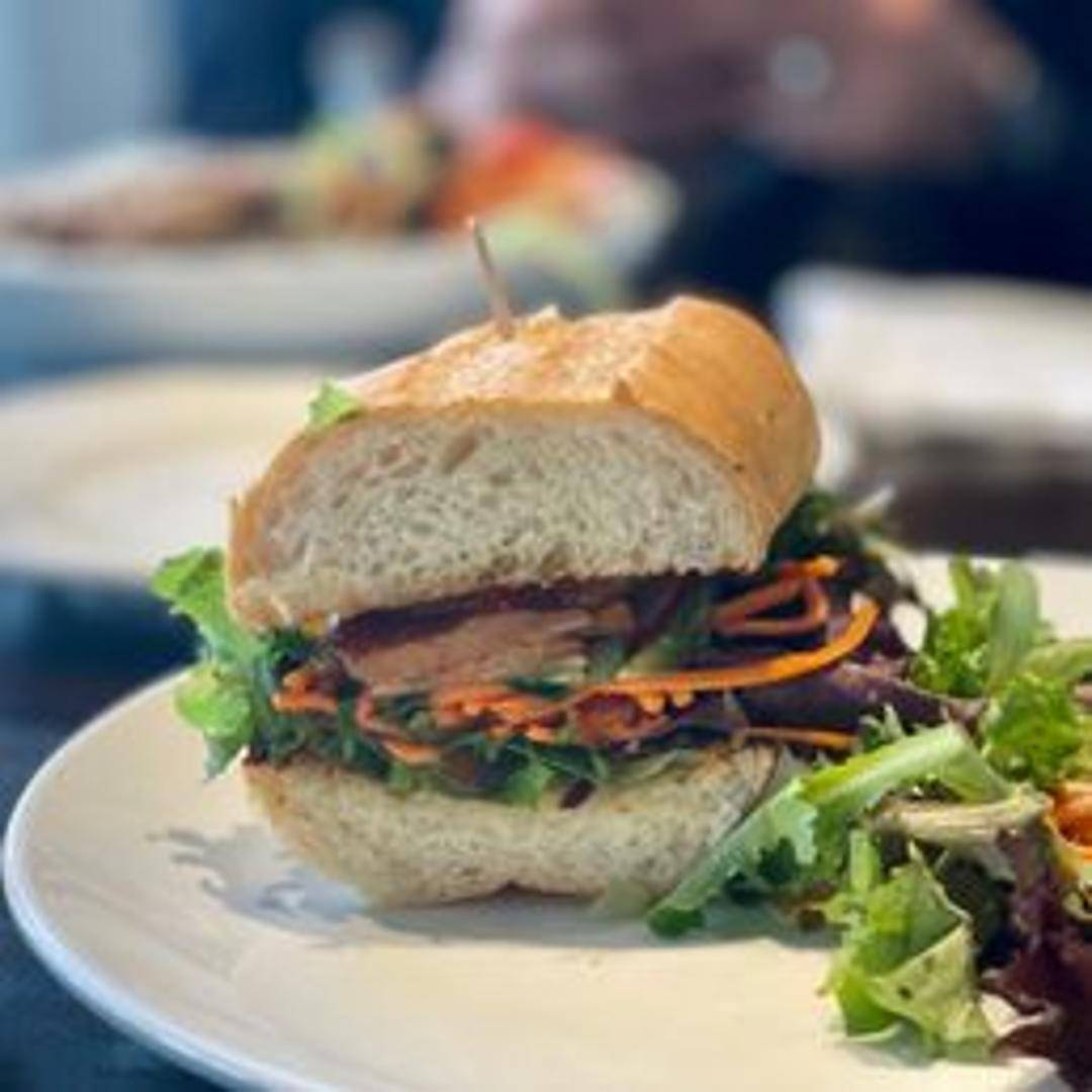 A Vietnamese sandwich featuring your choice of protein (grilled pork, chicken, or tofu) on a toasted baguette with pickled carrots and daikon radish, fresh cilantro, sliced cucumber, and a spicy mayo. A perfect blend of textures and flavors.