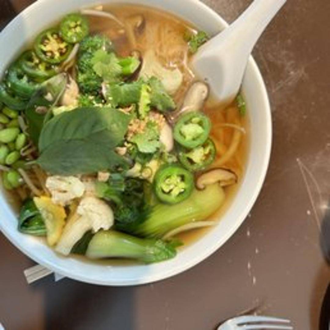A flavorful and aromatic vegan broth simmered with rice noodles, tofu, mushrooms, and an assortment of fresh herbs and vegetables. Garnished with bean sprouts, jalapenos, and lime wedges. Customize it with your favorite hot sauce!