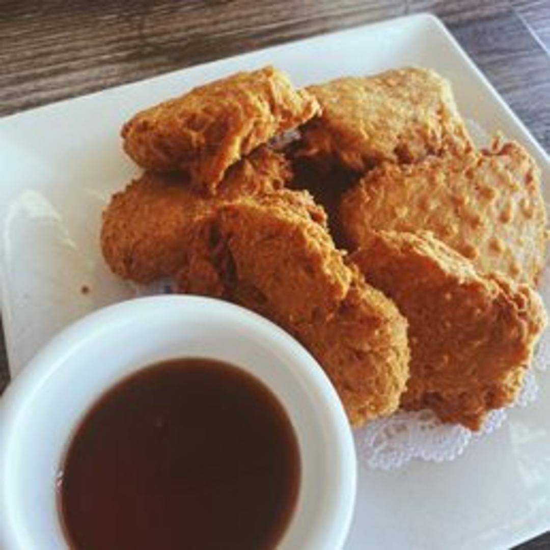 Crispy, golden-brown vegan chicken nuggets, perfect as an appetizer or a light meal. Served with your choice of dipping sauce.