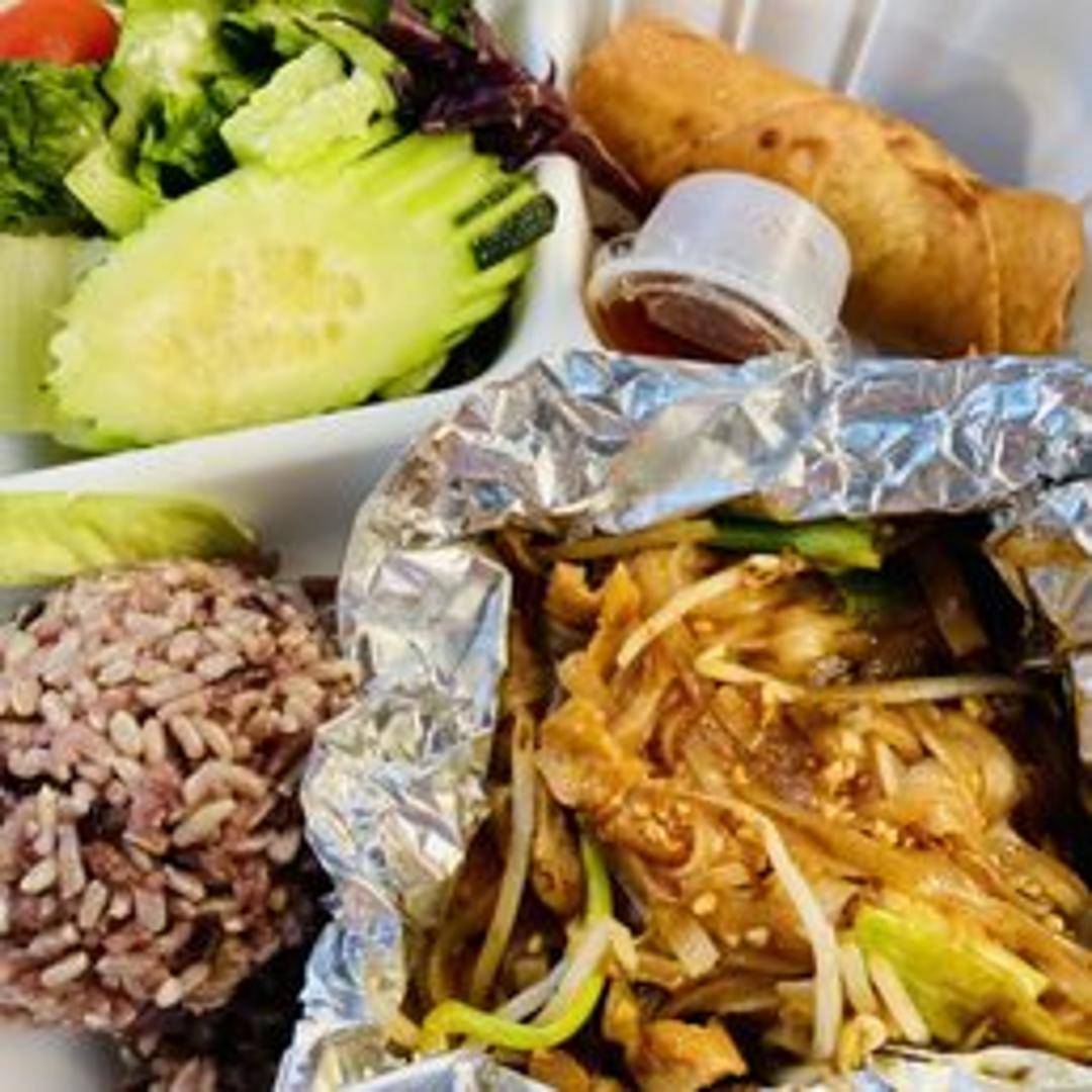 Classic Thai rice noodles stir-fried with tofu, bean sprouts, green onions, and peanuts in a tangy and savory Pad Thai sauce. Garnished with lime.