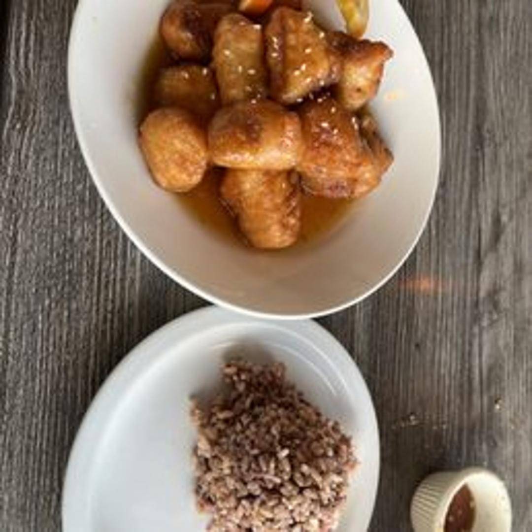 Crispy, vegan 'chicken' pieces coated in a sweet and tangy orange-flavored sauce. The sauce is made with fresh orange zest, creating a vibrant and aromatic flavor. Served with a light garnish.