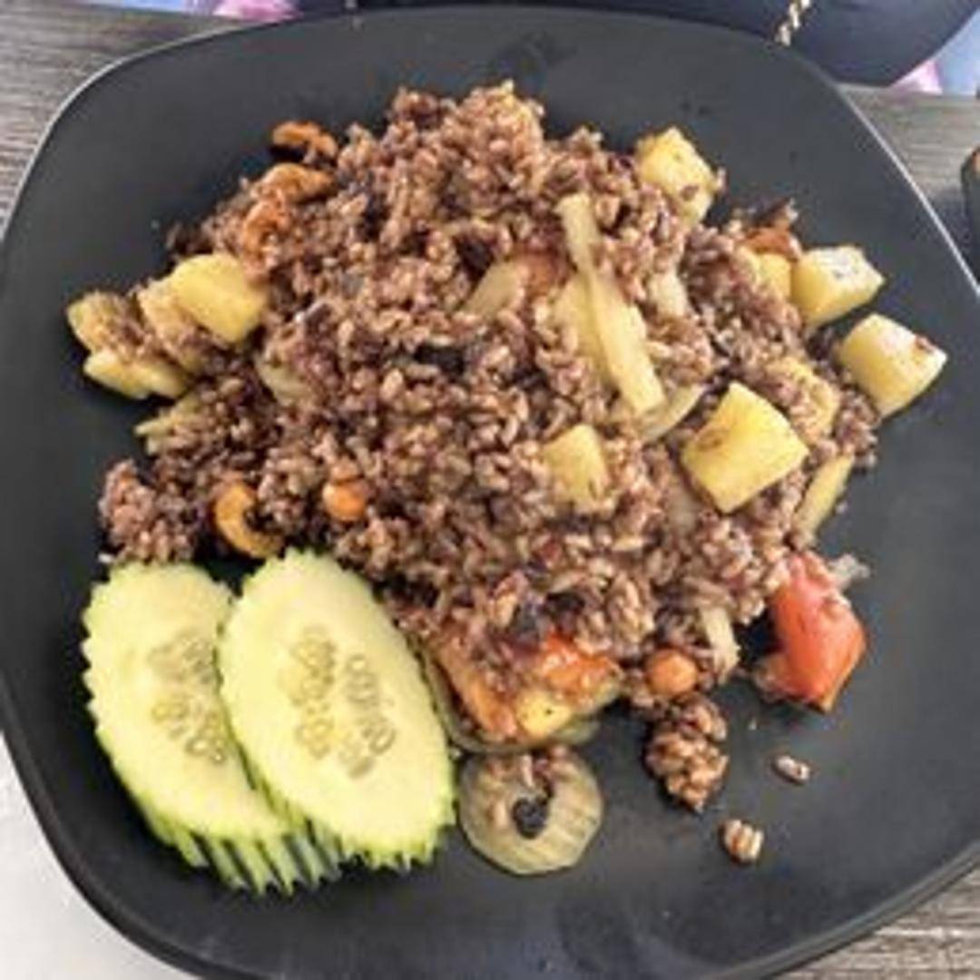 A vibrant and flavorful fried rice dish cooked with chunks of sweet pineapple, colorful vegetables like carrots and peas, and savory plant-based protein. Seasoned with a unique blend of spices, this dish offers a delightful balance of sweet and savory flavors.