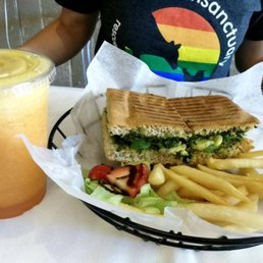 A vegetarian delight! This panini features a creamy avocado spread, sweet corn kernels, fresh spinach, and melted cheese, all grilled to perfection between slices of toasted bread. A satisfying and flavorful handheld meal.