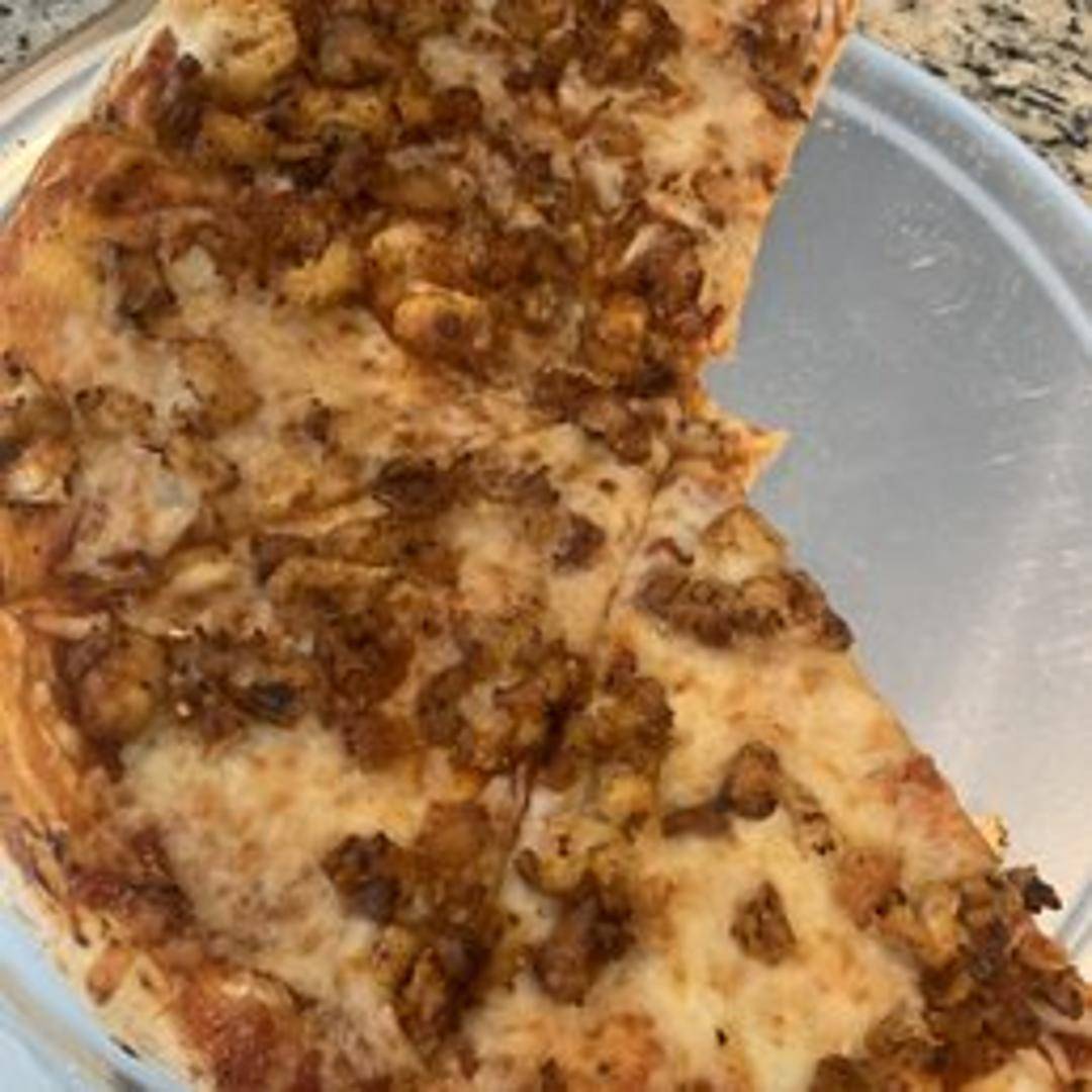 An Indo-Chinese inspired pizza with marinated and crispy fried paneer (Indian cheese) in a tangy Manchurian sauce, topped with cheese and fresh vegetables on a pizza crust.