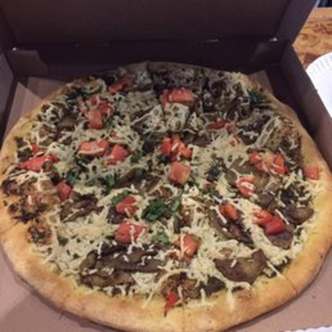 A pizza featuring tender roasted eggplant slices atop a flavorful tomato sauce and melted mozzarella cheese. Enhanced with aromatic herbs and spices for a Mediterranean-inspired taste.