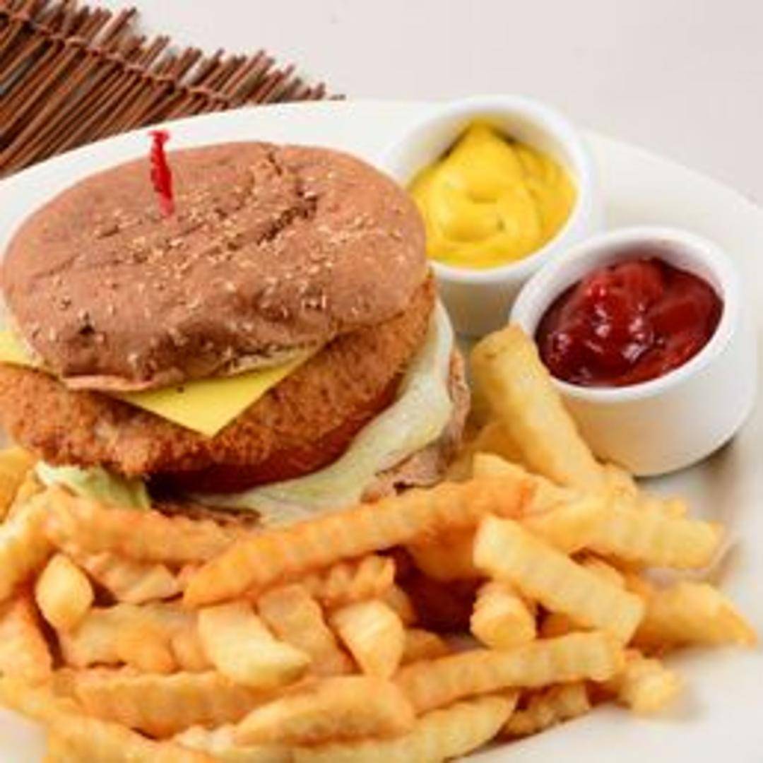 A vegan chicken patty, breaded and deep-fried to crispy perfection, served on a toasted bun with lettuce, tomato, onion, and vegan mayonnaise. A satisfying and flavorful plant-based alternative to a classic burger.
