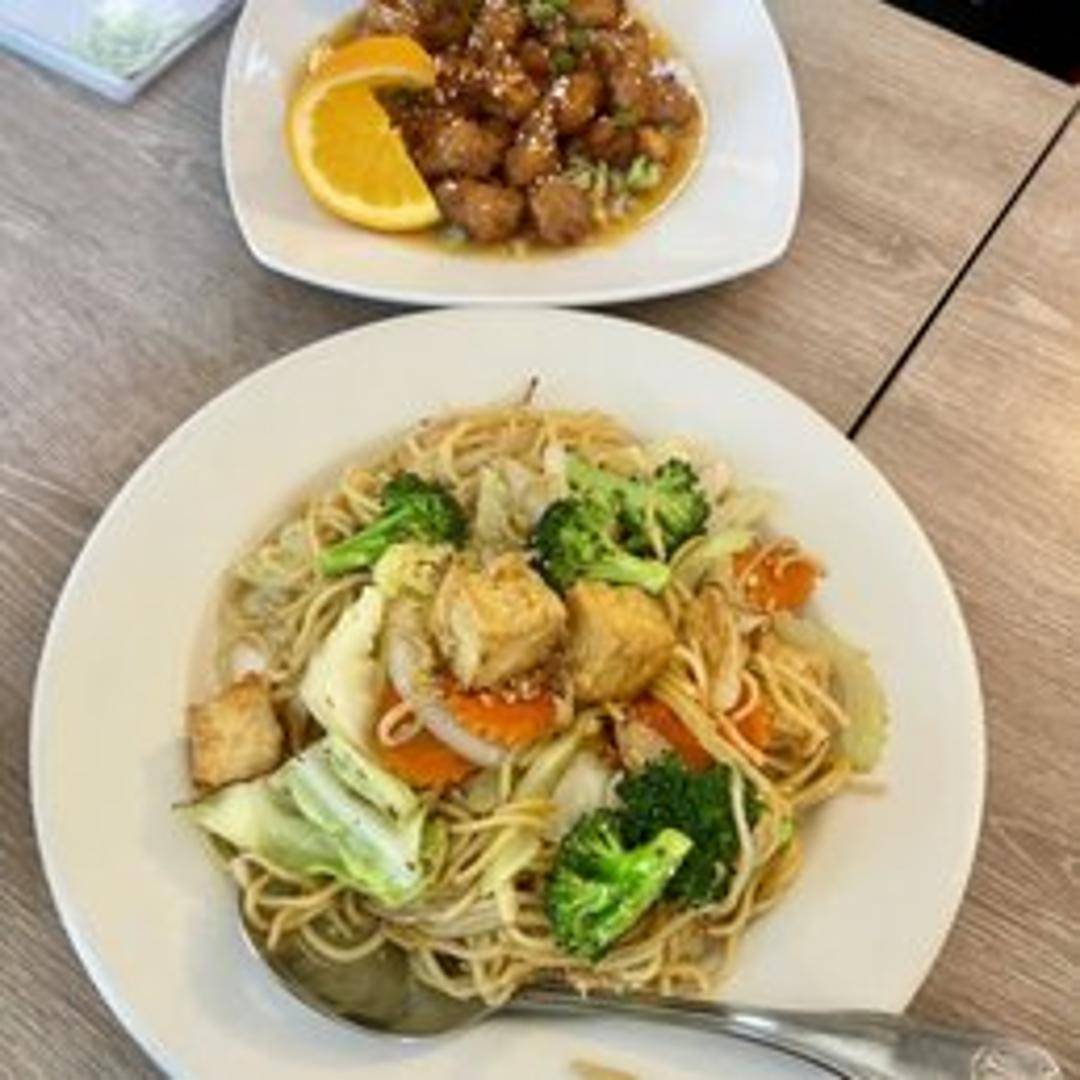 Stir-fried wheat noodles with mixed vegetables, and your choice of protein (tofu, vegetables, or mock meat options). Served with a light soy-based sauce.