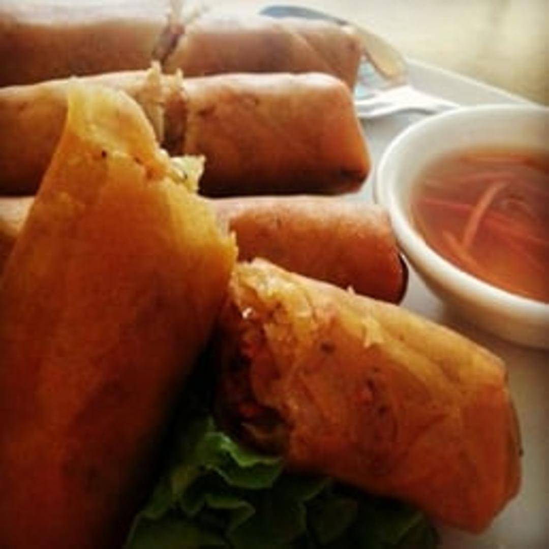 Crispy, deep-fried egg rolls filled with a flavorful mixture of shredded cabbage, carrots, celery, and other vegetables, encased in a thin, golden-brown wrapper. Served with a sweet and sour dipping sauce.