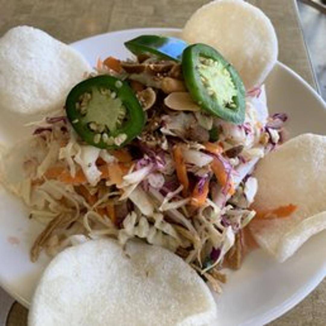 A refreshing and crunchy salad featuring thinly sliced lotus root, tossed with a light and tangy dressing. May include other vegetables and herbs for added flavor and texture.