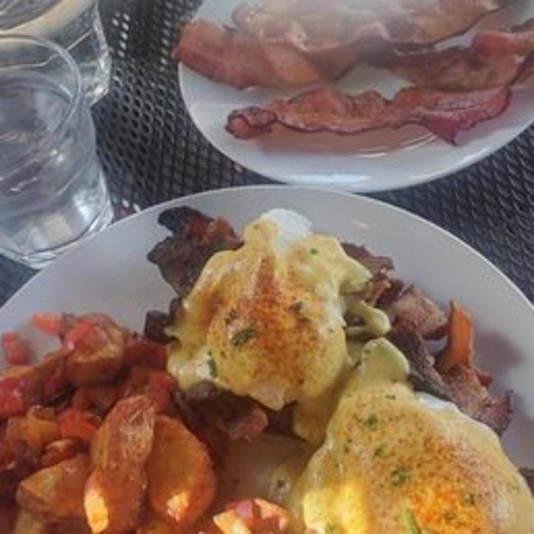 A classic Eggs Benedict featuring toasted English muffins topped with grilled bacon, poached eggs, and a generous serving of creamy hollandaise sauce. Served with your choice of side.