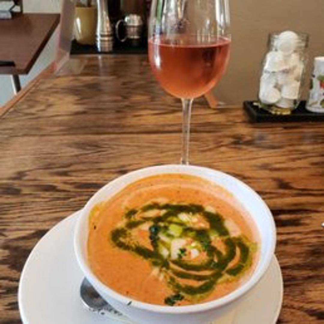 A creamy and smooth tomato soup made with roasted tomatoes, herbs, and a touch of cream. Garnished with fresh basil and served with grilled croutons.