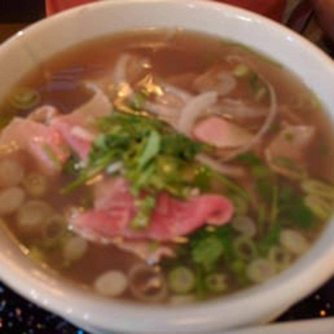 Enjoy a traditional Vietnamese Pho Tai, a classic noodle soup highlighting thinly sliced rare beef. The delicate slices of lean beef are briefly cooked by the hot, aromatic beef broth as you stir them, ensuring tender perfection. Served with traditional rice noodles and a fresh plate of basil, cilantro, bean sprouts, lime, and jalapeños to enhance the flavors.