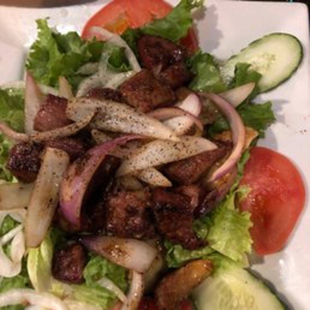 Indulge in our signature Shaky Beef (Bo Luc Lac), featuring tender cubes of premium beef, expertly wok-seared with garlic, onions, and bell peppers until caramelized and flavorful. Served atop a fresh bed of crisp lettuce, juicy tomatoes, and cool cucumbers, this savory dish is perfectly complemented by our tangy lime dipping sauce, offering a delightful blend of textures and tastes.