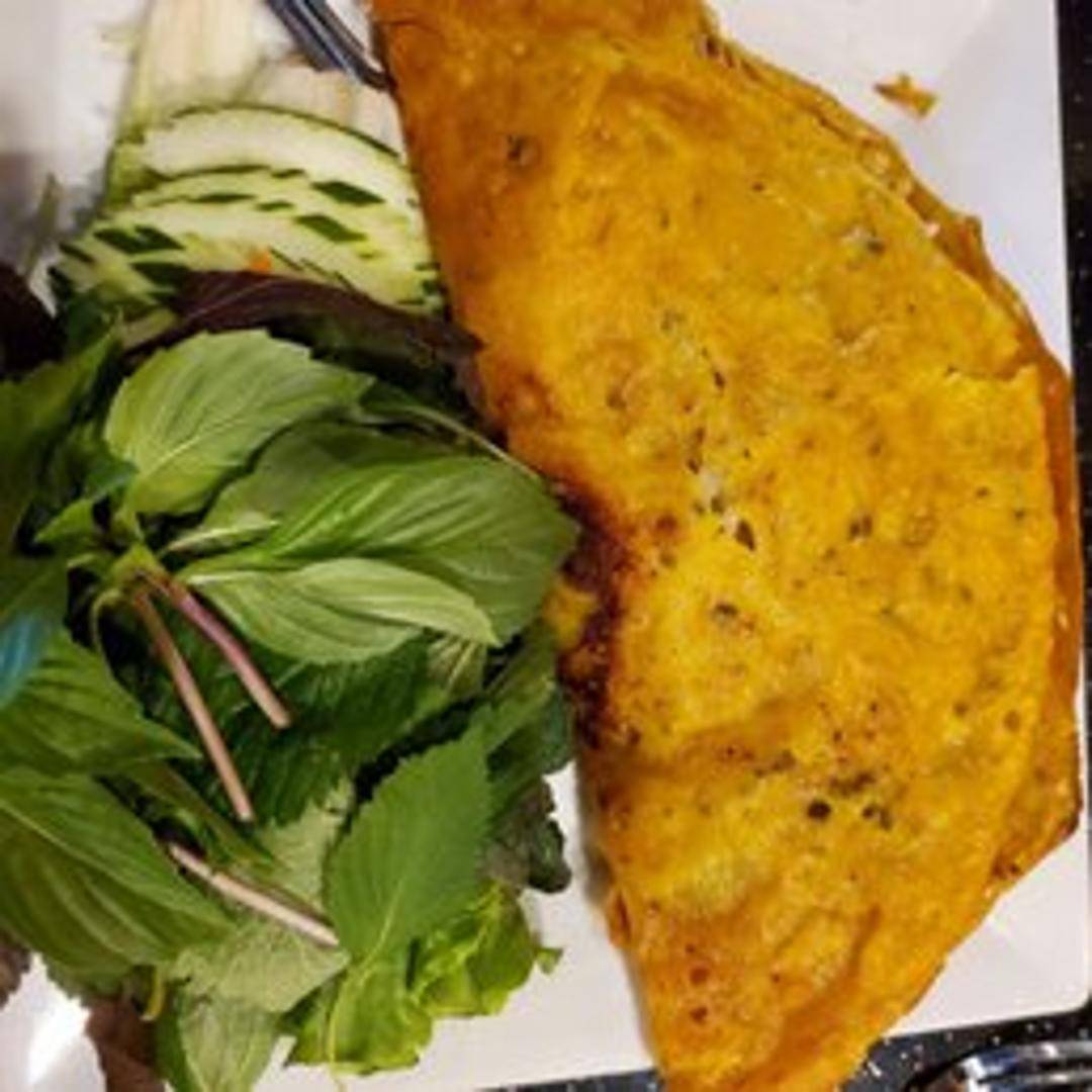 Discover the delightful Vietnamese savory crepe, Banh Xeo. This crispy, golden-brown pancake is made from a turmeric-infused batter and generously filled with succulent shrimp, tender slices of pork, and crunchy bean sprouts. It's traditionally served with fresh lettuce, an assortment of aromatic herbs, and a side of nước chấm (Vietnamese dipping sauce) for a customizable, flavorful bite.
