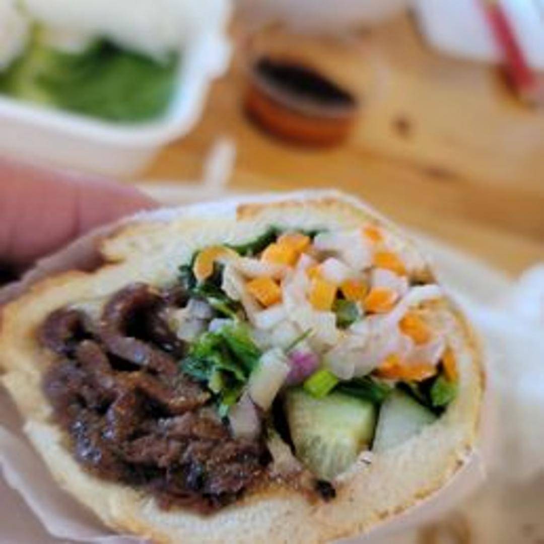 A flavorful Vietnamese sandwich featuring grilled sirloin steak, spicy kimchi, pickled vegetables, cilantro, and a special sauce on a toasted baguette.